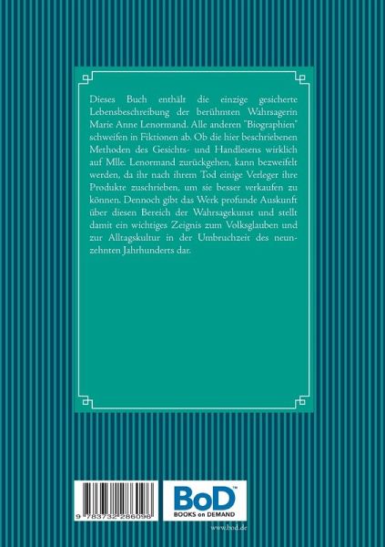 Dieses Buch enthält die einzige gesicherte Lebensbeschreibung der berühmten Wahrsagerin Marie Anne Lenormand. Alle anderen "Biographien" schweifen in Fiktionen ab. Ob die hier beschriebenen Methoden des Gesichts- und Handlesens wirklich auf Mlle. Lenormand zurückgehen, kann bezweifelt werden, da ihr nach ihrem Tod einige Verleger ihre Produkte zuschrieben, um sie besser verkaufen zu können. Dennoch gibt das Werk profunde Auskunft über diesen Bereich der Wahrsagekunst und stellt damit ein wichtiges Zeignis zum Volksglauben und zur Alltagskultur in der Umbruchzeit des neunzehnten Jahrhunderts dar.