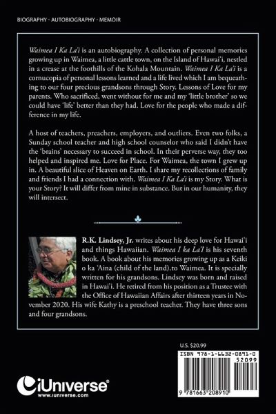 R.K. Lindsey, Jr. writes about his deep love for Hawai'i and things Hawaiian. Waimea I ka La'I is his seventh book. A book about his memories growing up as a Keiki o ka 'Aina (child of the land).to Waimea. It is specially written for his grandsons. Lindsey was born and raised in Hawai'i. He retired from his position as a Trustee with the Office of Hawaiian Affairs after thirteen years in November 2020. His wife Kathy is a preschool teacher. They have three sons and four grandsons.