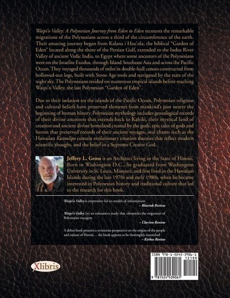 Waipi’o Valley: A Polynesian Journey from Eden to Eden recounts the remarkable migrations of the Polynesians across a third of the circumference of the earth. Their amazing journey began from Kalana i Hau’ola, the biblical "Garden of Eden" located along the shore of the Persian Gulf, extended to the Indus River Valley of ancient Vedic India, to Egypt where some ancestors of the Polynesians were on the Israelite Exodus, through Island Southeast Asia and across the Pacific Ocean. They voyaged thousands of miles in double-hull canoes constructed from hollowed-out logs, built with Stone Age tools and navigated by the stars of the night sky. The Polynesians resided on numerous tropical islands before reaching Waipi’o Valley, the last Polynesian "Garden of Eden". Due to their isolation on the islands of the Pacific Ocean, Polynesian religious and cultural beliefs have preserved elements from mankind’s past nearer the beginning of human history. Polynesian mythology includes genealogical records of their divine ancestors that extends back to Kahiki, their mystical land of creation and ancient divine homeland created by the gods, epic tales of gods and heroes that preserved records of their ancient voyages, oral chants such as the Hawaiian Kumulipo contain evolutionary creation theories that reflect modern scientific thought, and the belief in a Supreme Creator God.