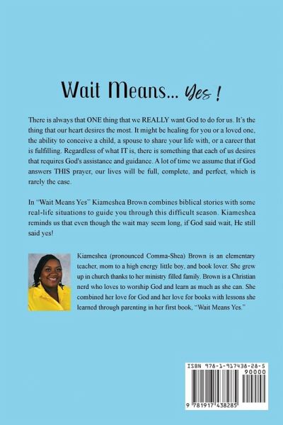 Start reading now and experience the life-changing results of Wait Means...Yes by Kiameshea Brown. Discover the power and hope that comes from patiently waiting for answers to our deepest desires and prayers. With biblical wisdom and real-life examples, this book will guide you through the challenges and rewards of waiting with faith and trust in God's plan. - Transform your waiting into a time of growth and preparation - Overcome doubt and impatience with the assurance of God's promises - Embrace the journey of waiting and find peace and fulfillment - Experience the joy of receiving a divine "yes" after a time of waiting - Find comfort and encouragement in the stories of others who have waited and received their heart's desires In Wait Means Yes, you will find: - Biblical insights and teachings on the power of waiting - Real-life stories of individuals who have experienced the blessings of waiting - Practical tips for navigating the challenges and emotions of waiting - Encouragement and hope for those feeling discouraged or weary in their waiting journey