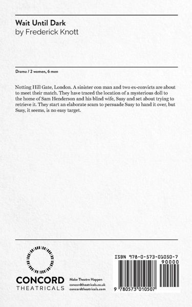 Notting Hill Gate, London. A sinister con man and two ex-convicts are about to meet their match. They have traced the location of a mysterious doll to the home of Sam Henderson and his blind wife, Susy and set about trying to retrieve it. They start an elaborate scam to persuade Susy to hand it over, but Susy, it seems, is no easy target. Wait Until Dark, made into a film starring Audrey Hepburn in 1967, is often ranked as one of the top 100 scariest films of all time.2 women, 6 men