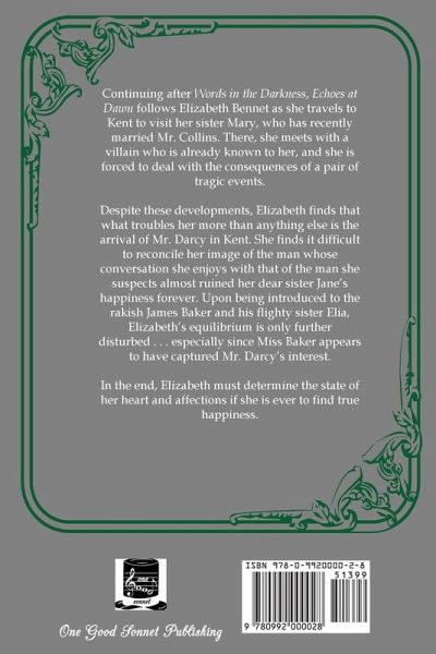 Continuing after Words in the Darkness, Echoes at Dawn follows Elizabeth Bennet as she travels to Kent to visit her sister Mary, who has recently married Mr. Collins. There, she meets with a villain who is already known to her, and she is forced to deal with the consequences of a pair of tragic events. Despite these developments, Elizabeth finds that what troubles her more than anything else is the arrival of Mr. Darcy in Kent. She finds it difficult to reconcile her image of the man whose conversation she enjoys with that of the man she suspects almost ruined her dear sister Jane's happiness forever. Upon being introduced to the rakish James Baker and his flighty sister Elia, Elizabeth's equilibrium is only further disturbed . . . especially since Miss Baker appears to have captured Mr. Darcy's interest. In the end, Elizabeth must determine the state of her heart and affections if she is ever to find true happiness.