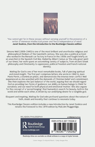 Waiting for God is one of her most remarkable books, full of piercing spiritual and moral insight. The first part comprises letters she wrote in 1942 to Jean-Marie Perrin, a Dominican priest, and demonstrate the intense inner conflict Weil experienced as she wrestled with the demands of Christian belief and commitment. She then explores the 'just balance' of the world, arguing that we should regard God as providing two forms of guidance: our ability as human beings to think for ourselves; and our need for both physical and emotional 'matter.' She also argues for the concept of a 'sacred longing'; that humanity's search for beauty, both in the world and within each other, is driven by our underlying desire for a tangible god.
