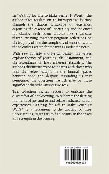 In "Waiting for Life to Make Sense (It Won't)," the author takes readers on an introspective journey through the chaotic landscape of existence, capturing the essence of uncertainty and the quest for clarity. Each poem unfolds like a delicate thread, weaving together poignant reflections on the fragility of life, the complexity of emotions, and the relentless search for meaning amidst the noise. With raw honesty and lyrical beauty, the verses explore themes of yearning, disillusionment, and the acceptance of life's inherent absurdity. The author's distinctive voice resonates with those who find themselves caught in the liminal spaces between hope and despair, reminding us that sometimes the questions we ask may be more significant than the answers we seek. This collection invites readers to embrace the discomfort of not knowing, to celebrate the fleeting moments of joy, and to find solace in shared human experiences. "Waiting for Life to Make Sense (It Won't)" is a testament to the artistry of life's uncertainties, urging us to find beauty in the chaos and strength in the waiting.