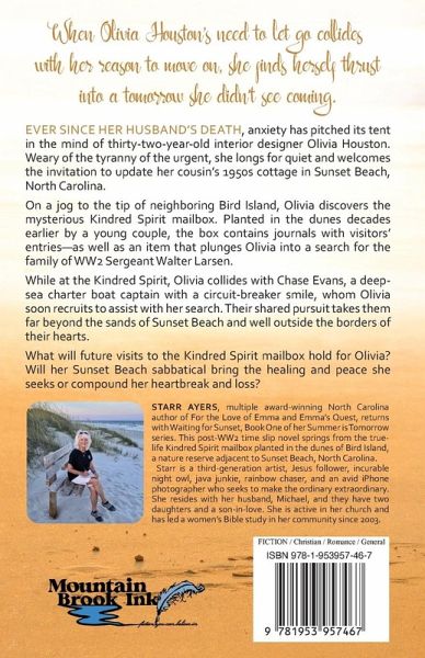 When Olivia Houston's need to let go collides with her reason to move on, she finds herself thrust into a tomorrow she didn't see coming. Ever since her husband's death, anxiety has pitched its tent in the mind of thirty-two-year-old interior designer Olivia Houston. Weary of the tyranny of the urgent, she longs for quiet and welcomes the invitation to update her cousin's 1950s cottage in Sunset Beach, North Carolina. On a jog to the tip of neighboring Bird Island, Olivia discovers the mysterious Kindred Spirit mailbox. Planted in the dunes decades earlier by a young couple, the box contains journals with visitors' entries-as well as an item that plunges Olivia into a search for the family of WW2 Sergeant Walter Larsen. While at the Kindred Spirit, Olivia collides with Chase Evans, a deep-sea charter boat captain with a circuit-breaker smile, whom Olivia soon recruits to assist with her search. Their shared pursuit takes them far beyond the sands of Sunset Beach and well outside the borders of their hearts. What will future visits to the Kindred Spirit mailbox hold for Olivia? Will her Sunset Beach sabbatical bring the healing and peace she seeks or compound her heartbreak and loss?