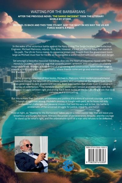In the wake of his victorious battle against the Navy during The Sargo Incident, the audacious Engineer, Michael Matrozos, returns. This time, however, it's not just the US Navy that stands in his path. The US Air Force makes its presence known and threats from the government loom large as Michael must fear for his life as he navigates a world riddled with corruption and danger. Set amongst a beautiful Hawaiian backdrop, dive into the heart of industrial Hawaii with "The Honolulu Quartet," a thrilling saga that unravels power, ambition, and corruption on a barely imaginable scale. Michael, a mastermind of engineering and construction, takes center stage in a world where loyalty is a rare commodity, where friends come and go and enemies accumulate like shadows. In this gripping collection of four books, Michael A. Matrozos takes readers on a whirlwind adventure through the labyrinth of business, politics, and corruption at the highest level. From cranes gone rogue to dark government secrets, from legal battles that shake trust to a poignant journey of redemption, "The Honolulu Quartet" sizzles with tension and resonates with the timeless struggle between right and wrong. Each book builds on the last, crafting a tale that is as complex as it is compelling. But this is more than just a tale of business and politics; it's a story of survival, courage, and the triumph of right over wrong. Michael's journey is fraught with peril, as he faces not only professional challenges but personal threats that test his very will to live. His battle is emblematic of the universal struggle for justice, integrity, and honor. Hold on tight, as "Waiting for the Barbarians" takes you on a rollercoaster ride that will leave you breathless and hungry for more. Witness the power of perseverance, tenacity, and the courage to stand up for what's right, and the unbreakable spirit of a man who refuses to be defeated.