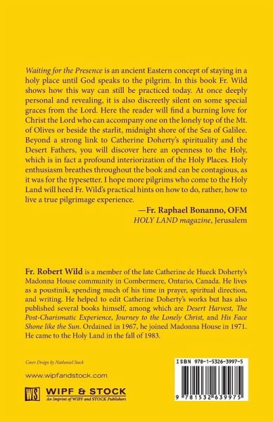 Waiting for the Presence is an ancient Eastern concept of staying in a holy place until God speaks to the pilgrim. In this book Fr. Wild shows how this way can still be practiced today. At once deeply personal and revealing, it is also discreetly silent on some special graces from the Lord. Here the reader will find a burning love for Christ the Lord who can accompany one on the lonely top of the Mt. of Olives or beside the starlit, midnight shore of the Sea of Galilee. Beyond a strong link to Catherine Doherty's spirituality and the Desert Fathers, you will discover here an openness to the Holy, which is in fact a profound interiorization of the Holy Places. Holy enthusiasm breathes throughout the book and can be contagious, as it was for the typesetter. I hope more pilgrims who come to the Holy Land will heed Fr. Wild's practical hints on how to do, rather, how to live a true pilgrimage experience. --Fr. Raphael Bonanno, OFM, HOLY LAND magazine, Jerusalem Fr. Robert Wild is a member of the late Catherine de Hueck Doherty's Madonna House community in Combermere, Ontario, Canada. He lives as a poustinik, spending much of his time in prayer, spiritual direction, and writing. He helped to edit Catherine Doherty's works but has also published several books himself, among which are Desert Harvest, The Post-Charismatic Experience, Journey to the Lonely Christ, and His Face Shone like the Sun. Ordained in 1967, he joined Madonna House in 1971. He came to the Holy Land in the fall of 1983.