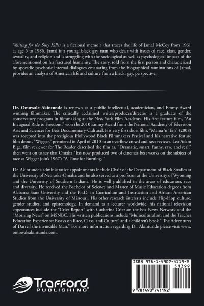 Waiting for the Sissy Killer is a fictional memoir that traces the life of Jamal McCoy from 1961, at age five, to 1986. Jamal is a young black gay man who deals with issues of race, class, gender, sexuality, and religion and is struggling with the sociological as well as psychological impact of the aforementioned on his fractured humanity. The story, told from the first person and characterized by sporadic psychotic internal dialogues emanating from the biographical ruminations of Jamal, provides an analysis of American life and culture from a black gay perspective.