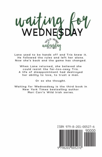 Lane used to be hands off and Tris knew it. He followed the rules and left her alone. Now she's back and the game has changed. When Lane returned, she believed she could resist the far-too-sexy Tris. A life of disappointment had destroyed her ability to love, to trust a man. Or so she thought. Waiting for Wednesdsay is the third book in New York Times bestselling author Mari Carr's Wild Irish series.