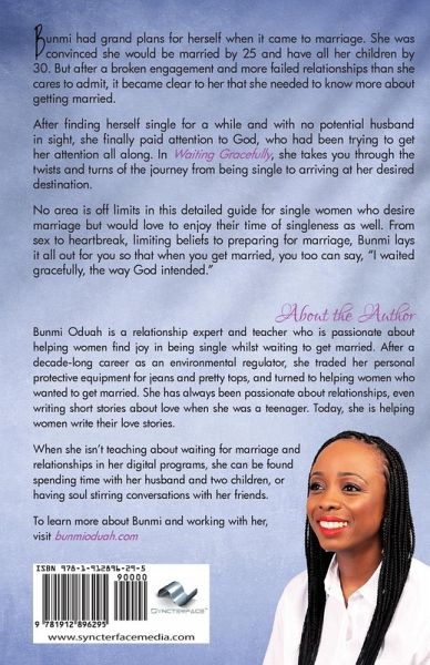 Bunmi had grand plans for herself when it came to marriage. She was convinced she would be married by 25 and have all her children by 30. After a broken engagement and more failed relationships than she cares to admit, it became clear to her that she needed to know more about getting married.After finding herself single for a while, and with no potential husband in sight, she finally paid attention to God, who had been trying to get her attention all along. In Waiting Gracefully, she takes you through the twists and turns of the journey from being single to arriving at her desired destination.No area is off limits in this detailed guide for single women who desire marriage but would love to enjoy their time of singleness as well. From sex to heartbreak, limiting beliefs to preparing for marriage, Bunmi lays it all out for you so that when you get married you too can say, "I waited gracefully, the way God intended."