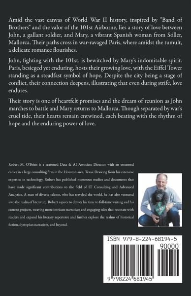 Amid the vast canvas of World War II history, inspired by "Band of Brothers" and the valor of the 101st Airborne, lies a story of love between John, a gallant soldier, and Mary, a vibrant Spanish woman from Sóller, Mallorca. Their paths cross in war-ravaged Paris, where amidst the tumult, a delicate romance flourishes. John, fighting with the 101st, is bewitched by Mary's indomitable spirit. Paris, besieged yet enduring, hosts their growing love, with the Eiffel Tower standing as a steadfast symbol of hope. Despite the city being a stage of conflict, their connection deepens, illustrating that…mehr