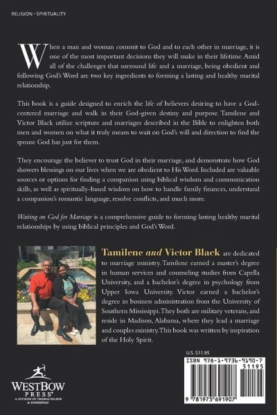 When a man and woman commit to God and to each other in marriage, it is one of the most important decisions they will make in their lifetime. Amid all of the challenges that surround life and a marriage, being obedient and following God's Word are two key ingredients to forming a lasting and healthy marital relationship. This book is a guide designed to enrich the life of believers desiring to have a God-centered marriage and walk in their God-given destiny and purpose. Tamilene and Victor Black utilize scripture and marriages described in the Bible to enlighten both men and women on what it truly means to wait on God's will and direction to find the spouse God has just for them. They encourage the believer to trust God in their marriage, and demonstrate how God showers blessings on our lives when we are obedient to His Word. Included are valuable sources or options for finding a companion using biblical wisdom and communication skills, as well as spiritually-based wisdom on how to handle family finances, understand a companion's romantic language, resolve conflicts, and much more. Waiting on God for Marriage is a comprehensive guide to forming lasting healthy marital relationships by using biblical principles and God's Word.