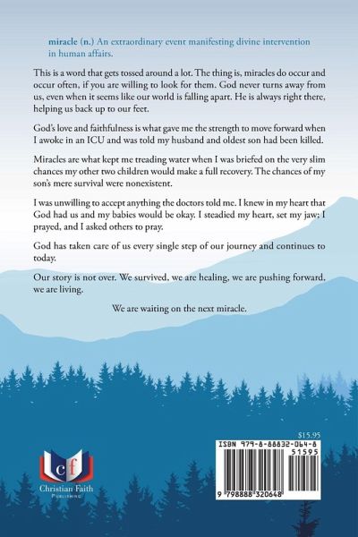 miracle (n.) An extraordinary event manifesting divine intervention in human affairs. This is a word that gets tossed around a lot. The thing is, miracles do occur and occur often, if you are willing to look for them. God never turns away from us, even when it seems like our world is falling apart. He is always right there, helping us back up to our feet. God's love and faithfulness is what gave me the strength to move forward when I awoke in an ICU and was told my husband and oldest son had been killed. Miracles are what kept me treading water when I was briefed on the very slim chances my other two children would make a full recovery. The chances of my son's mere survival were nonexistent. I was unwilling to accept anything the doctors told me. I knew in my heart that God had us and my babies would be okay. I steadied my heart, set my jaw; I prayed, and I asked others to pray. God has taken care of us every single step of our journey and continues to today. Our story is not over. We survived, we are healing, we are pushing forward, we are living. We are waiting on the next miracle.