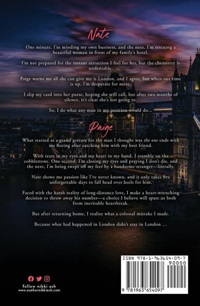 Nate One minute, I'm minding my own business, and the next, I'm rescuing a beautiful woman in front of my family's hotel. I'm not prepared for the instant attraction I feel for her, but the chemistry is undeniable. Paige warns me all she can give me is London, and I agree, but when our time is up, I'm desperate for more. I slip my card into her purse, hoping she will call, but after two months of silence, it's clear she's not going to. So, I do what any man in my position would do ... I go after her. Paige What started as a grand gesture for the man I thought was the one ends with me fleeing after catching him with my best friend. With tears in my eyes and my heart in my hand, I stumble on the cobblestone. One second, I'm closing my eyes and praying I don't die, and the next, I'm being swept off my feet by a handsome stranger-literally. Nate shows me passion like I've never known, and it only takes five unforgettable days to fall head over heels for him. Faced with the harsh reality of long-distance love, I make a heart-wrenching decision to throw away his number-a choice I believe will spare us both from inevitable heartbreak. But after returning home, I realize what a colossal mistake I made. Because what had happened in London didn't stay in London ...