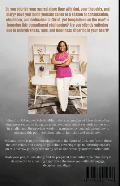 Rolesta Milian, divorced mother of four, has devoted this singleness season to living pure, despite perceiving it certainly comes with its challenges. She provides wisdom, transparency, and advice on how to navigate this path, shedding light on her trials and testimony. Milian's desire is to promote obedience to the Word of God, comfort to those that can relate, and a helpful guideline covering steps to faithfully embark on this narrow journey that many see as unnecessary and/or unattainable. Grab your pen, follow along, and be prepared to be vulnerable. This diary is designed to be a healing experience as you willingly engage, decipher, and digest.
