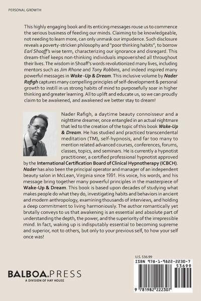 This highly engaging book and its enticing messages rouse us to commence the serious business of feeding our minds. Claiming to be knowledgeable, not needing to learn more, can only unmask our impudence. Such disclosure reveals a poverty-stricken philosophy and "poor thinking habits", to borrow Earl Shoaff's wise term, characterizing our ignorance and disregard. This dream-thief keeps non-thinking individuals impoverished all throughout their lives. The wisdom in Shoaff's words revolutionized many lives, including mentors such as Jim Rhone and Tony Robbins, and indeed inspired many powerful messages in Wake -Up & Dream. This inclusive volume by Nader Rafigh captures many compelling principles of self-development & personal growth to instill in us strong habits of mind to purposefully soar in higher thinking and greater learning. All to uplift and educate us, so we can proudly claim to be awakened, and awakened we better stay to dream!