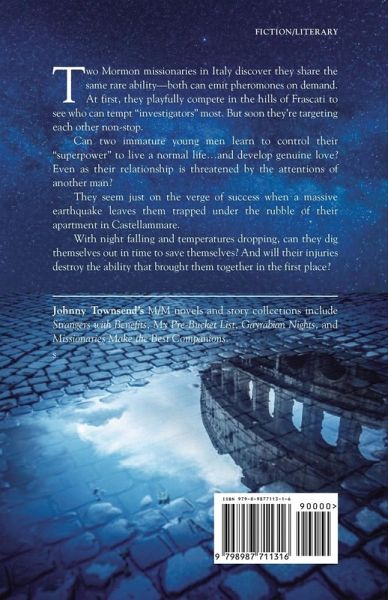 Two Mormon missionaries in Italy discover they share the same rare ability-both can emit pheromones on demand. At first, they playfully compete in the hills of Frascati to see who can tempt "investigators" most. But soon they're targeting each other non-stop. Can two immature young men learn to control their "superpower" to live a normal life...and develop genuine love? Even as their relationship is threatened by the attentions of another man? They seem just on the verge of success when a massive earthquake leaves them trapped under the rubble of their apartment in Castellammare. With night falling and temperatures dropping, can they dig themselves out in time to save themselves? And will their injuries destroy the ability that brought them together in the first place?