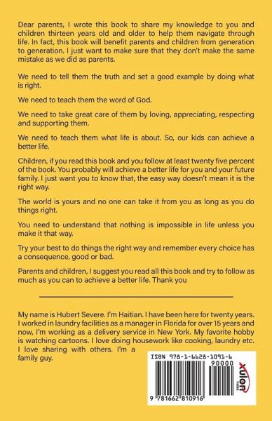 Dear parents, I wrote this book to share my knowledge to you and children thirteen years old and older to help them navigate through life. In fact, this book will benefit parents and children from generation to generation. I just want to make sure that they don't make the same mistake as we did as parents. We need to tell them the truth and set a good example by doing what is right. We need to teach them the word of God. We need to take great care of them by loving, appreciating, respecting and supporting them. We need to teach them what life is about. So, our kids can achieve a better life. Children, if you read this book and you follow at least twenty five percent of the book. You probably will achieve a better life for you and your future family. I just want you to know that, the easy way doesn't mean it is the right way. The world is yours and no one can take it from you as long as you do things right. You need to understand that nothing is impossible in life unless you make it that way. Try your best to do things the right way and remember every choice has a consequence, good or bad. Parents and children, I suggest you read all this book and try to follow as much as you can to achieve a better life. Thank you My name is Hubert Severe. I'm Haitian. I have been here for twenty years. I worked in laundry facilities as a manager in Florida for over 15 years and now, I'm working as a delivery service in New York. My favorite hobby is watching cartoons. I love doing housework like cooking, laundry etc. I love sharing with others. I'm a family guy.