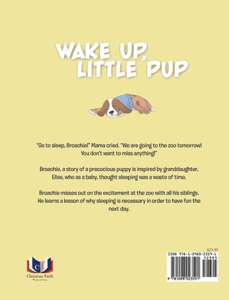 "Go to sleep, Broachie!" Mama cried. "We are going to the zoo tomorrow! You don't want to miss anything!" Broachie, a story of a precocious puppy is inspired by granddaughter, Elise, who as a baby, thought sleeping was a waste of time. Broachie misses out on the excitement at the zoo with all his siblings. He learns a lesson of why sleeping is necessary in order to have fun the next day.