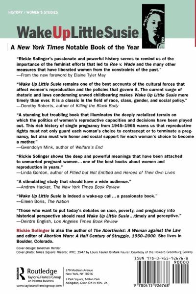 Rickie Solinger's passionate and powerful history serves to remind us of the importance of the feminist efforts that led to Roe v. Wade and the many other measures that have liberated women from the constraints of the past. -From the new foreword by Elaine Tyler May Twenty-five years after the Supreme Court's landmark decision, abortion rights are as fiercely contested as ever and current debates over welfare, workfare, and public assistance to women with children demonstrate the way in which race and class continue to effect women's reproductive freedom. A pioneering work, Wake Up Little Susie reveals how current attitudes toward these issues developed by examining their roots in the postwar era and discerning how differently they affected black and white women. A powerful and shocking book, Susie is a must-read for anyone seeking to understand the complex and disturbing politics surrounding issues of race, class and reproductive rights. This new edition includes a foreword by the esteemed social historian, Elaine Tyler May, and an afterword by the author that places the issues examined in Susie in the context of the current controversies.