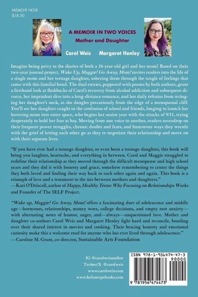 Imagine being privy to the diaries of both a 16-year-old girl and her mom! Based on their two-year journal project, Wake Up, Maggie! Go Away, Mom! invites readers into the life of a single mom and her teenage daughter, ushering them through the tangle of feelings that come with this familial bond. The dual entries, peppered with poems by both authors, grant a firsthand look at flashbacks of Carol's recovery from alcohol addiction and subsequent divorce, her imprudent dive into a long-distance romance, and her daily refrains from wringing her daughter's neck, as she dangles precariously from the edge of a menopausal cliff. You'll see her daughter caught in the confusion of school and friends, longing to launch her hovering mom into outer space, who begins her senior year with the attacks of 9/11, trying desperately to hold her fear at bay. Moving from one voice to another, readers eavesdrop on their frequent power struggles, chronic doubts and fears, and humorous ways they wrestle with the grief of letting each other go as they re-negotiate their relationship and move on with their separate lives.