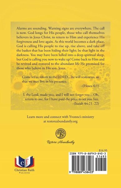 Alarms are sounding. Warning signs are everywhere. The call is now. God longs for His people, those who call themselves believers in Jesus Christ, to return to Him and experience His forgiveness and love again. As this world becomes a dark place, God is calling His people to rise up, rise above, and take off the basket that has been hiding their light; be that light in the darkness. You may have been lulled into a deep spiritual sleep, but God is calling you now to wake up! Come back to Him and be revived and restored to the abundant life He promised for those who believe in His son, Jesus. Come let us return to the LORD...he will restore us, so that we may live in his presence. (Hosea 6:1) I, the Lord, made you, and I will not forget you...Oh, return to me, for I have paid the price to set you free. (Isaiah 44:21-22) Learn more and connect with Yvonne's ministry at restoreabundantly.org