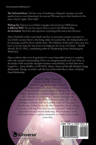 The Universal Story: Life has a way of catching us off guard, turning our world upside down or even shattering it in a second. We react ony to find ourselves in the same "old pit" again. Now what? Waking Up : Discover your hidden strategies and reveal your (W)holeness. A different WAY: You are the expert! All you need is the Wisdom Map. An invitation: Read this and experience surprising relief and potent aliveness. Alaya Chadwick is able to put hands and feet on extremely complex concepts in a way which connects them to the living reality of everyday life...An indispensable tool for assessing oneself in those volatile times. The brilliancy of this path is that once you learn to use the map, the way home is lovingly put into your own hands. - Martha Harrell, M.S.N. Ph.D., contributing author to Transforming Terror: Reclaiming the World Soul. Alaya confirms what we've long feared: it's a near impossible journey to complete with only a partial understanding of how one integrates psyche and soul. Here, in the hands of this storyteller, therapist-minister extraordinaire, we find what we've longed for. - Sunny Shulkin, LCSW, BCD, Master Trainer of Harville Hendrix's Imago Relationship Therapy, co-author with Pat Love of the book How to Ruin a Perfectly Good Relationship.