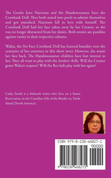 The Greeks have Narcissus and the Haudenosaunee have the Cornhusk Doll. They both stared into pools to admire themselves and got punished. Narcissus fell in love with himself. The Cornhusk Doll had her face taken away by her Creator, so she was no longer distracted from her duties. Both stories are parables against vanity in their respective cultures. Wakia, the No Face Cornhusk Doll has learned humility over the centuries of her existence in this short story. However, she wants her face back. The Haudenosaunee children have lost interest in her. They all want to play with the Settlers' dolls. Will the Creator grant Wakia's request? Will the Rez kids play with her again?