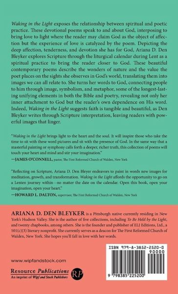 Waking in the Light exposes the relationship between spiritual and poetic practice. These devotional poems speak to and about God, interposing to bring love to light where the reader may claim God as the object of affection but the experience of love is catalyzed by the poem. Depicting the deep affection, tenderness, and devotion she has for God, Ariana D. Den Bleyker explores Scripture through the liturgical calendar during Lent as a spiritual practice to bring the reader closer to God. These beautiful contemporary poems describe the wonders of nature and the value the poet places on the sights she observes in God's world, translating them into images we can all relate to. She turns her words to God, connecting people to him through image, symbolism, and metaphor, some of the longest-lasting unifying elements in both the Bible and poetry, revealing not only her inner attachment to God but the reader's own dependence on His word. Indeed, Waking in the Light suggests faith is tangible and beautiful, as Den Bleyker writes through Scripture interpretation, leaving readers with powerful images that linger.