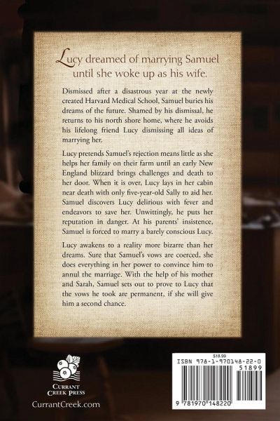 Lucy dreamed of marrying Samuel until she woke up as his wife. Dismissed after a disastrous year at the newly created Harvard Medical School, Samuel Wilson buries his dream of becoming a doctor. Shamed by his dismissal, he returns to his north shore home, where he avoids his former fiancée Lucy Simms and tries to dismiss all ideas of marrying her. Lucy pretends Samuel's rejection means little as she helps her family on their farm. An early New England blizzard brings challenges and death to her door. When it is over, Lucy lays in her cabin near death with only five-year-old Sally to aid her. Samuel discovers Lucy delirious with fever and endeavors to save her from the fatal illness that claimed most of her family. Unwittingly he puts her reputation in danger. At his parents' insistence, Samuel marries a barely conscious Lucy.Lucy awakens to a reality more bizarre than her dreams. Sure that Samuel's vows are coerced, she does everything in her power to convince him to annul the marriage. With the help of his mother and Sarah, he sets out to prove to Lucy that the vows he took are permanent, if she will give him a second chance.