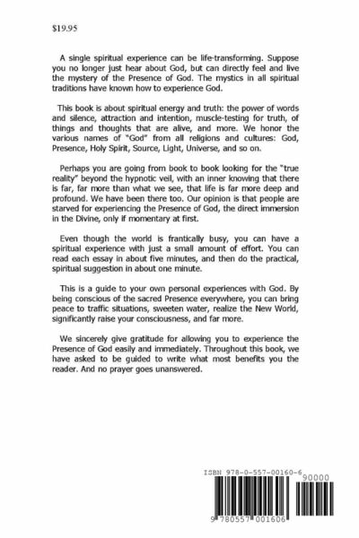 A single spiritual experience can be life-transforming. The mystics in all spiritual traditions have known how to experience God. You can too. This book is about spiritual energy and truth. You can read each essay in about five minutes, and then do the practical, spiritual suggestion in about one minute. By being conscious of the sacred Presence everywhere, you can bring peace to traffic situations, sweeten water, realize the New World, significantly raise your consciousness, and far more. We sincerely give gratitude for allowing you to experience the Presence of God easily and immediately. Throughout this book, we have asked to be guided to write what most benefits you the reader. And no prayer goes unanswered.