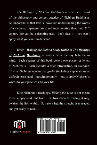 The Writings of Nichiren Daishonin is a written record of the philosophy and correct practice of Nichiren Buddhism. As important as that text is, however, understanding the words of a medieval Japanese priest and incorporating them into 21st century life can be a daunting task. Let's face it - you can't apply what you can't understand. Enter - Waking the Lion: a Study Guide to The Writings of Nichiren Daishonin - written with the lay believer in mind. Each chapter of this book covers one gosho, or letter, of Nichiren's. Each includes a brief introduction, an overview of what Nichiren says in that gosho (including explanations of difficult terms) and - most importantly - how to apply Nichiren's words to your practice and your life. Like Nichiren's teachings, Waking the Lion is not meant to be simply read, but lived. Be forewarned: reading it may awaken the lion within. So take a healthy stretch, dear reader, and get ready to roar..