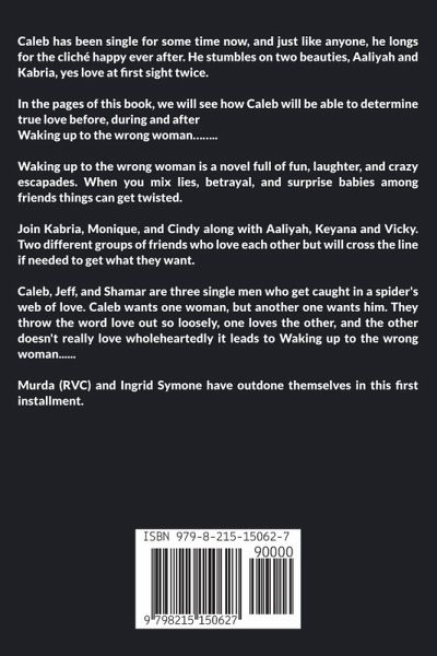Caleb has been single for some time now, and just like anyone, he longs for the cliché happy ever after. He stumbles on two beauties, Aaliyah and Kabria, yes love at first sight twice. In the pages of this book, we will see how Caleb will be able to determine true love before, during and after Waking up to the wrong woman…….. Waking up to the wrong woman is a novel full of fun, laughter and crazy escapades. When you mix lies, betrayal and surprise babies among friends things can get twisted. Join Kabria, Monique, and Cindy along with Aaliyah, Keyana and Vicky. Two different groups of friends who love each other but will cross the line if needed to get what they want. Caleb, Jeff, and Shamar are three single men who get caught in a spider's web of love. Caleb wants his one woman, but another one wants him. They throw the word love out so loosely, one loves the other, and the other doesn't really love whole hearted it leads to Waking up to the wrong woman...... Murda (RVC) and Ingrid Symone has outdid themselves in this first installment.