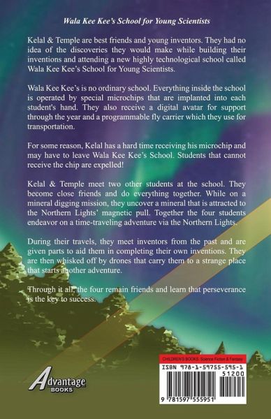 Wala Kee Kee's School for Young Scientists Kelal & Temple are best friends and young inventors. They had no idea of the discoveries they would make while building their inventions and attending a new highly technological school called Wala Kee Kee's School for Young Scientists. Wala Kee Kee's is no ordinary school. Everything inside the school is operated by special microchips that are implanted into each student's hand. They also receive a digital avatar for support through the year and a programmable fly carrier which they use for transportation. For some reason, Kelal has a hard time receiving his microchip and may have to leave Wala Kee Kee's School. Students that cannot receive the chip are expelled! Kelal & Temple meet two other students at the school. They become close friends and do everything together. While on a mineral digging mission, they uncover a mineral that is attracted to the Northern Lights' magnetic pull. Together the four students endeavor on a time-traveling adventure via the Northern Lights. During their travels, they meet inventors from the past and are given parts to aid them in completing their own inventions. They are then whisked off by drones that carry them to a strange place that starts another adventure. Through it all, the four remain friends and learn that perseverance is the key to success.