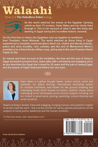 The world watched as Egyptians rose up together for the first time in history to overthrow President Hosni Mubarak. It could've been a gripping tale straight out of a movie, with communication blackouts, violent and bloody protests, police and army brutality, curfews, and fighter jet flybys. But for those living in Egypt this was real life. Living through it all was British author Dawn Bates and her family. Walaahi is her epic account of living and working in Egypt during this unbelievable moment in history, kick-started by protests in Tunisia, which spread across the Arab world. With deep honesty and openness, Dawn shares what life is really like in Egypt with its broken education system, sexual harassment by civilians and police thugs alike, dirty streets and corruption. This is life through the eyes of a white British Muslim who not only speaks Arabic, but understands the intricacies of the politics, Islamic faith, the food, and cultural nuances the world has never seen before. Interwoven with the beauty of the country, the warmth and strong desire of the Egyptian people to better themselves and their country, Dawn takes us on an emotional ride through the paradoxes, wonderful aromas of delicious food, toothless grins and shining eyes, relaxing quiet moments of felucca rides along the Nile, and the chaos of the Khan el-lKhalili bazaar. Discover the questions she asked herself as she walked away from Islam. And how cross-cultural love, when transferred to a different setting, truly impacts the children of mixed ethnicity and background. Detailing the start of Mohamed Morsi's presidency in accurate detail, being followed by secret police, and appearing in the world's media in an attempt to get the facts across to those around the world, Dawn's bravery in the face of adversity shines through. Highlighting how a sexual predator followed her and her children through the metro system, only to have the harassment dismissed as 'nothing to worry about', to celebrating the entrepreneurs driving change in a country best known for the Pyramids of Giza, the Sphinx, the Library of Alexandria and diving in The Red Sea and Sharm el-Sheik, this epic memoir packs into four years what many do not live through in a lifetime. As many began to switch off from the horrific events, Dawn and her family continued to live through the curfews, home invasions and stories manipulated for inflated viewing figures. Dawn writes with a refreshing and engaging voice as she describes this momentous time in history which saw the Muslim Brotherhood leader Mohammed Morsi become president in the first democratic election in the country's history; before Human Rights Watch declared the Rabaa massacre the bloodiest massacre ever reported in one day. Bates shares her heartbreak of seeing the Egypt she loves and the will of the people of Egypt destroyed before her eyes, only to see them rise up together again to rebuild stronger than ever, much like their Arab cousins in Lebanon after the Israeli bombings. Navigating the vast cultural landscapes belly dancing amongst one another, watching Christians, Jews and Muslims live harmoniously together, what Dawn shares is enlightening. We learn of the inadequacies in Egyptian schools, racism and prejudice faced by her and her children, and are left in awe at her fierce love, courage and strength as she takes on hatred and turns it into powerful action. With a devastating blow at the end, this book is guaranteed to make readers stop and reflect on how they respond to events in their own lives and sets the record straight on untruths about Egypt many only know through resorts and all-inclusive holidays. With brilliantly funny anecdotes, tear-jerk moments and a heart worn on her sleeve, Dawn Bates is the voice of humanity, cultural diversity and inclusion the world needs to hear from.