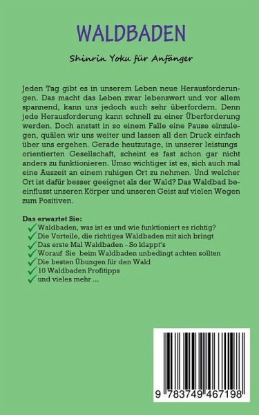 Sie möchten Ihrem Körper und Ihrem Geist etwas Gutes tun? Sie möchten die Methodik des Waldbadens Schritt-für-Schritt kennenlernen? Dann ist dieses Buch das Richtige für Sie! Jeden Tag gibt es in unserem Leben neue Herausforderungen. Das macht das Leben zwar lebenswert und vor allem spannend, kann uns jedoch auch sehr überfordern. Denn jede Herausforderung kann schnell zu einer Überforderung werden. Doch anstatt in so einem Falle eine Pause einzulegen, quälen wir uns weiter und lassen all den Druck einfach über uns ergehen. Gerade heutzutage, in unserer leistungsorientierten Gesellschaft, scheint es fast schon gar nicht anders zu funktionieren. Umso wichtiger ist es, sich auch mal eine Auszeit an einem ruhigen Ort zu nehmen. Und welcher Ort ist dafür besser geeignet als der Wald? Das Waldbad beeinflusst unseren Körper und unseren Geist auf vielen Wegen zum Positiven.