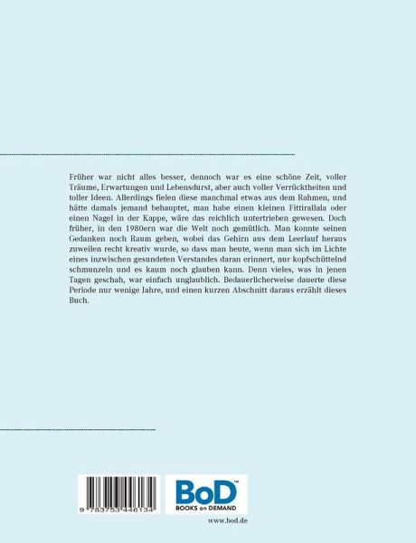 Früher war nicht alles besser, trotzdem war es eine schöne Zeit, voller Träume, Erwartungen und Lebensdurst, aber auch voller Verrücktheiten und toller Ideen. Allerdings fielen diese manchmal etwas aus dem Rahmen, und hätte damals jemand behauptet, man habe einen kleinen Fittirallala oder einen Nagel in der Kappe, wäre das noch reichlich untertrieben gewesen. Doch früher, in den 1980ern, war die Welt noch gemütlich. Man konnte seinen Gedanken noch Raum geben, wobei das Gehirn aus dem Leerlauf heraus zuweilen recht kreativ wurde, so dass man heute, wenn man sich im Lichte eines inzwischen gesundeten Verstandes daran erinnert, nur kopfschüttelnd schmunzeln und es kaum noch glauben kann. Denn vieles, was in jenen Tagen geschah, war einfach unglaublich. Bedauerlicherweise dauerte diese Periode nur wenige Jahre, und einen kurzen Abschnitt daraus erzählt dieses Buch.