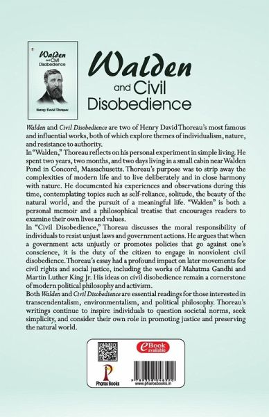 "Walden" and "Civil Disobedience" are two of Henry David Thoreau's most famous and influential works, both of which explore themes of individualism, nature, and resistance to authority. In "Walden," Thoreau reflects on his personal experiment in simple living. He spent two years, two months, and two days living in a small cabin near Walden Pond in Concord, Massachusetts. Thoreau's purpose was to strip away the complexities of modern life and to live deliberately and in close harmony with nature. He documented his experiences and observations during this time, contemplating topics such as self-reliance, solitude, the beauty of the natural world, and the pursuit of a meaningful life. "Walden" is both a personal memoir and a philosophical treatise that encourages readers to examine their own lives and values. In "Civil Disobedience," Thoreau discusses the moral responsibility of individuals to resist unjust laws and government actions. He argues that when a government acts unjustly or promotes policies that go against one's conscience, it is the duty of the citizen to engage in nonviolent civil disobedience. Thoreau's essay had a profound impact on later movements for civil rights and social justice, including the works of Mahatma Gandhi and Martin Luther King Jr. His ideas on civil disobedience remain a cornerstone of modern political philosophy and activism. Both "Walden" and "Civil Disobedience" are essential readings for those interested in transcendentalism, environmentalism, and political philosophy. Thoreau's writings continue to inspire individuals to question societal norms, seek simplicity, and consider their own role in promoting justice and preserving the natural world.