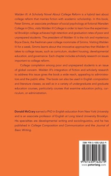 Walden III: A Scholarly Novel About College Reform is a hybrid text about college reform that marries fiction with academic scholarship. In this book, Peter Simms, an associate professor of social psychology at fictional Marsden College in Ohio, visits Walden III College in order to learn how the experimental Brooklyn college achieves high retention and graduation rates of poor and unprepared students. The president of Walden III is the rich and mysterious Bryce Davis, the freshman-year college roommate of Simms. Visiting Walden III for a week, Simms learns about the innovative approaches that Walden III takes to college issues, such as curriculum, student housing, developmental education, and governance. Each chapter includes scholarly research on issues important to college reform.