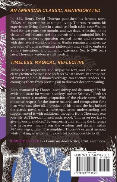 A Quiet Revolution "In wildness is the preservation of the world." So wrote Henry David Thoreau in 1854, when he published Walden after living for two years in a small cabin near Walden Pond. He lived there not in isolation, but in deliberate company with the earth. He measured time by the cracking of ice, by the chirping of crickets, by the sprout of beans. His book became a call to strip away the excess of society and live with purpose. At its heart, Walden was a quiet revolution. In an age of rapid industrial growth and social conformity, Thoreau's words urged readers to resist blind ambition, to simplify their lives, and to find truth in nature. His reflections helped shape American thought, inspiring generations of writers, environmentalists, and seekers to question what it means to live well. Yet the book was written in the language of its time...dense, patriarchal, and often closed to those not named in its pages. Nearly two centuries later, its wisdom still glimmers, but its voice can feel far away. A Modern Invitation In Walden-ish, Lilleth responds. With reverence for Thoreau's vision, she adapts the 19th-century classic for modern readers. She softens the thicket of archaic prose, welcomes women into the circle, and draws from Thoreau's journals to let his spirit speak more clearly. Here, the invitation is open to all. Whoever longs to slow down, step outside, and remember what it means to live deliberately. Krimsey Lilleth is a Louisiana-born writer, artist, and mother.