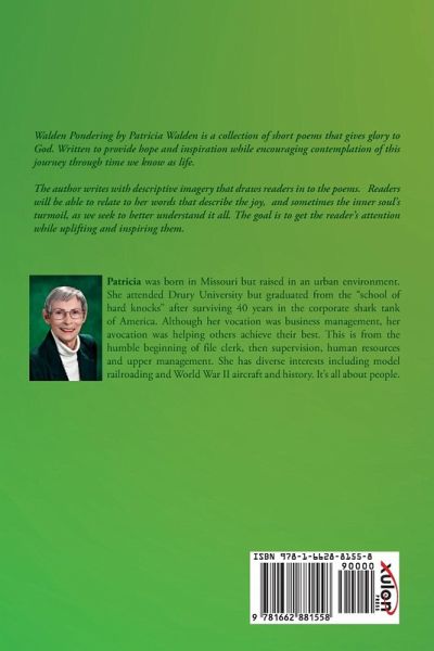 Walden Pondering by Patricia Walden is a collection of short poems that gives glory to God. Written to provide hope and inspiration while encouraging contemplation of this journey through time we know as life. The author writes with descriptive imagery that draws readers in to the poems. Readers will be able to relate to her words that describe the joy, and sometimes the inner soul's turmoil, as we seek to better understand it all. The goal is to get the reader's attention while uplifting and inspiring them. Patricia was born in Missouri but raised in an urban environment. She attended Drury University but graduated from the "school of hard knocks" after surviving 40 years in the corporate shark tank of America. Although her vocation was business management, her avocation was helping others achieve their best. This is from the humble beginning of file clerk, then supervision, human resources and upper management. She has diverse interests including model railroading and World War II aircraft and history. It's all about people.