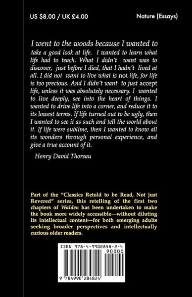 Part of the Classics Retold to be Read, Not just Revered series, this retelling of the first two chapters of "Walden" has been undertaken to make the book more widely accessible--without diluting its intellectual content.