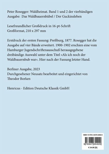 Peter Rosegger: Waldheimat. Band 1 und 2 der vierbändigen Ausgabe: Das Waldbauernbübel / Der GuckinslebenLesefreundlicher Großdruck in 16-pt-SchriftGroßformat, 210 x 297 mmBerliner Ausgabe, 2023Durchgesehener Neusatz bearbeitet und eingerichtet von Theodor BorkenErstdruck der ersten Fassung: Preßburg, 1877. Rosegger hat die Ausgabe auf vier Bände erweitert. 1900-1902 erschien eine vom Hamburger Jugendschriftenausschuß herausgegebene dreibändige Auswahl unter dem Titel »Als ich noch der Waldbauernbub war«. Hier nach der Fassung letzter Hand.Textgrundlage sind die Ausgaben:Peter Rosegger: Waldheimat. Erzählungen aus der Jugendzeit, Band 1: Das Waldbauernbübel, Gesammelte Werke von Peter Rosegger, Band 11, Leipzig: L. Stackmann, 1914.Peter Rosegger: Waldheimat. Erzählungen aus der Jugendzeit, Band 2: Der Guckinsleben, Gesammelte Werke von Peter Rosegger, Band 13, Leipzig: L. Stackmann, 1914.Umschlagabbildung: Ignaz Raffalt, Weite Landschaft mit Hirten, 1844Gesetzt aus der Minion Pro, 16 pt.Henricus - Edition Deutsche Klassik GmbH