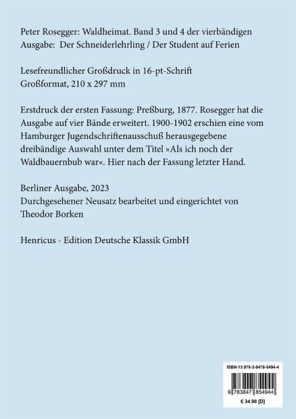 Peter Rosegger: Waldheimat. Band 3 und 4 der vierbändigen Ausgabe: Der Schneiderlehrling / Der Student auf FerienLesefreundlicher Großdruck in 16-pt-SchriftGroßformat, 210 x 297 mmBerliner Ausgabe, 2023Durchgesehener Neusatz bearbeitet und eingerichtet von Theodor BorkenErstdruck der ersten Fassung: Preßburg, 1877. Rosegger hat die Ausgabe auf vier Bände erweitert. 1900-1902 erschien eine vom Hamburger Jugendschriftenausschuß herausgegebene dreibändige Auswahl unter dem Titel »Als ich noch der Waldbauernbub war«. Hier nach der Fassung letzter Hand.Textgrundlage sind die Ausgaben:Peter Rosegger: Waldheimat. Erzählungen aus der Jugendzeit, Band 3: Der Schneiderlehrling, Gesammelte Werke von Peter Rosegger, Band 16, Leipzig: L. Stackmann, 1914.Peter Rosegger: Waldheimat. Erzählungen aus der Jugendzeit, Band 4: Der Student auf Ferien, Gesammelte Werke von Peter Rosegger, Band 20, Leipzig: L. Stackmann, 1914.Umschlagabbildung: Ignaz Raffalt, Weite Landschaft mit Hirten, 1844Gesetzt aus der Minion Pro, 16 pt.Henricus - Edition Deutsche Klassik GmbH