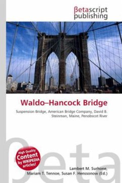 Please note that the content of this book primarily consists of articles available from Wikipedia or other free sources online. The Waldo Hancock Bridge was the first long-span suspension bridge erected in Maine, as well as the first permanent bridge across the Penobscot River below Bangor. The name comes from connecting Waldo and Hancock counties. The bridge was retired in 2006 as the new Penobscot Narrows Bridge was opened just a few yards away.The bridge is 2,040 feet (622 m) long with a clear center span of 800 feet (244 m) between towers. It has two 350 foot (107 m) side spans and carries a 20 foot (6 m) wide roadway with two 3-1/2 foot (1 m) sidewalks. It uses stiffening trusses that are 9 feet (2.7 m) deep. Each of the main suspender cables is 9-5/8 inches (24 cm) in diameter, and consists of 37 strands of 37 wires. The deck is 135 feet (41 m) above water level to allow passage of large ships. The total cost of the span was less than $850,000 in 1931 dollars (about $10 million in 2006 dollars), significantly under its allocated budget.