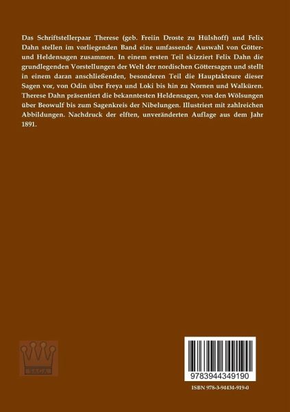 Das Schriftstellerpaar Therese (geb. Freiin Droste zu Hülshoff) und Felix Dahn stellen im vorliegenden Band eine umfassende Auswahl von Götter- und Heldensagen zusammen. In einem ersten Teil skizziert Felix Dahn die grundlegenden Vorstellungen der Welt der nordischen Göttersagen und stellt in einem daran anschließenden, besonderen Teil die Hauptakteure dieser Sagen vor, von Odin über Freya und Loki bis hin zu Nornen und Walküren. Therese Dahn präsentiert die bekanntesten Heldensagen, von den Wölsungen über Beowulf bis zum Sagenkreis der Nibelungen. Illustriert mit zahlreichen Abbildungen. Nachdruck der elften, unveränderten Auflage aus dem Jahr 1891.