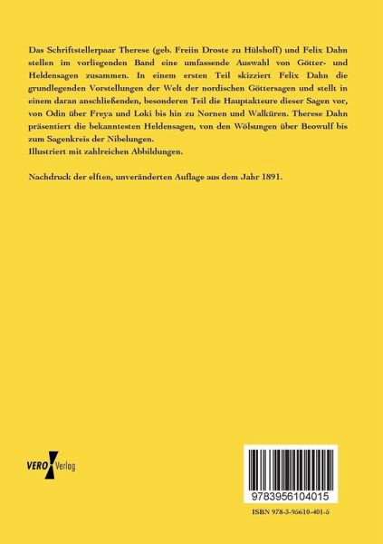 Das Schriftstellerpaar Therese (geb. Freiin Droste zu Hülshoff) und Felix Dahn stellen im vorliegenden Band eine umfassende Auswahl von Götter- und Heldensagen zusammen. In einem ersten Teil skizziert Felix Dahn die grundlegenden Vorstellungen der Welt der nordischen Göttersagen und stellt in einem daran anschließenden, besonderen Teil die Hauptakteure dieser Sagen vor, von Odin über Freya und Loki bis hin zu Nornen und Walküren. Therese Dahn präsentiert die bekanntesten Heldensagen, von den Wölsungen über Beowulf bis zum Sagenkreis der Nibelungen. Illustriert mit zahlreichen Abbildungen. Nachdruck der elften, unveränderten Auflage aus dem Jahr 1891.
