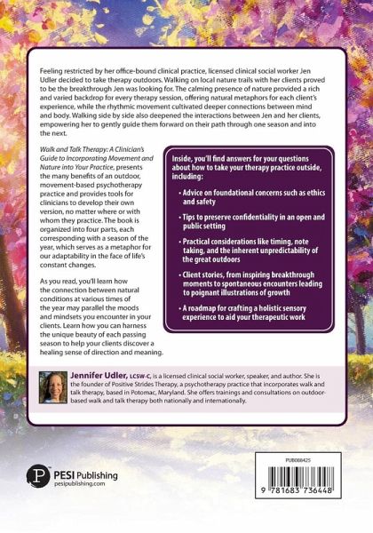 Feeling restricted by her office-bound clinical practice, licensed clinical social worker Jen Udler decided to take therapy outdoors. Walking on local nature trails with her clients proved to be the breakthrough Jen was looking for. The calming presence of nature provided a rich and varied backdrop for every therapy session, offering natural metaphors for each client's experience, while the rhythmic movement cultivated deeper connections between mind and body. Walking side by side also deepened the interactions between Jen and her clients, empowering her to gently guide them forward on their path through one season and into the next. In Walk and Talk Therapy: A Clinician's Guide to Incorporating Movement and Nature into Your Practice, Jen presents the many benefits of an outdoor, movement-based psychotherapy practice and provides tools for clinicians to develop their own version, no matter where or with whom they practice. The book is organized into four parts, each corresponding with a season of the year that serves as a metaphor for our adaptability in the face of life's constant changes. Inside, you'll find answers for your questions about how to take your therapy practice outside, including: · Advice on foundational concerns such as ethics and safety · Tips to preserve confidentiality in an open and public setting · Practical considerations like timing, note taking, and the inherent unpredictability of the great outdoors · Client stories, from inspiring breakthrough moments to spontaneous encounters leading to poignant illustrations of growth · A roadmap for crafting a holistic sensory experience to aid your therapeutic work As you read, you'll learn how the connection between natural conditions at various times of year may parallel the moods and mindsets you encounter in your clients. Learn how you can harness the unique beauty of each passing season to help your clients discover a healing sense of direction and meaning.