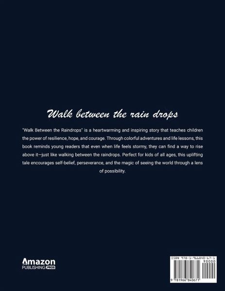 "Walk Between the Raindrops" is a heartwarming and inspiring story that teaches children the power of resilience, hope, and courage. Through colorful adventures and life lessons, this book reminds young readers that even when life feels stormy, they can find a way to rise above it-just like walking between the raindrops. Perfect for kids of all ages, this uplifting tale encourages self-belief, perseverance, and the magic of seeing the world through a lens of possibility.