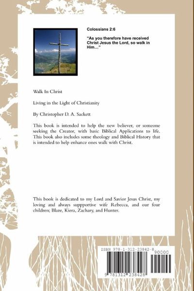 Walk In Christ. Living in the Light of Christianity. By Christopher D. A. Sackett This book is intended to help the new believer, or someone seeking the Creator, with basic Biblical Applications to life. This book also includes some theology and Biblical History that is intended to help enhance ones walk with Christ.